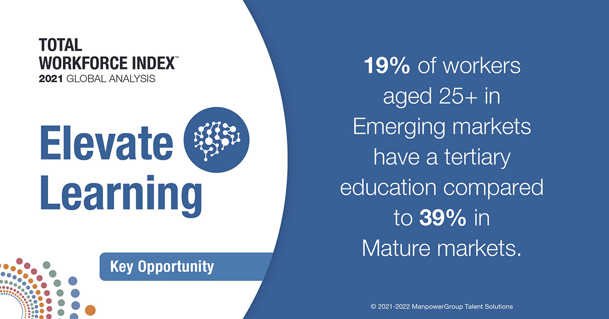 20% of workers in Emerging markets are highly-skilled (40% in Mature markets) with only 19% of workers aged 25+ in Emerging markets having a tertiary education compared to 39% in Mature markets.